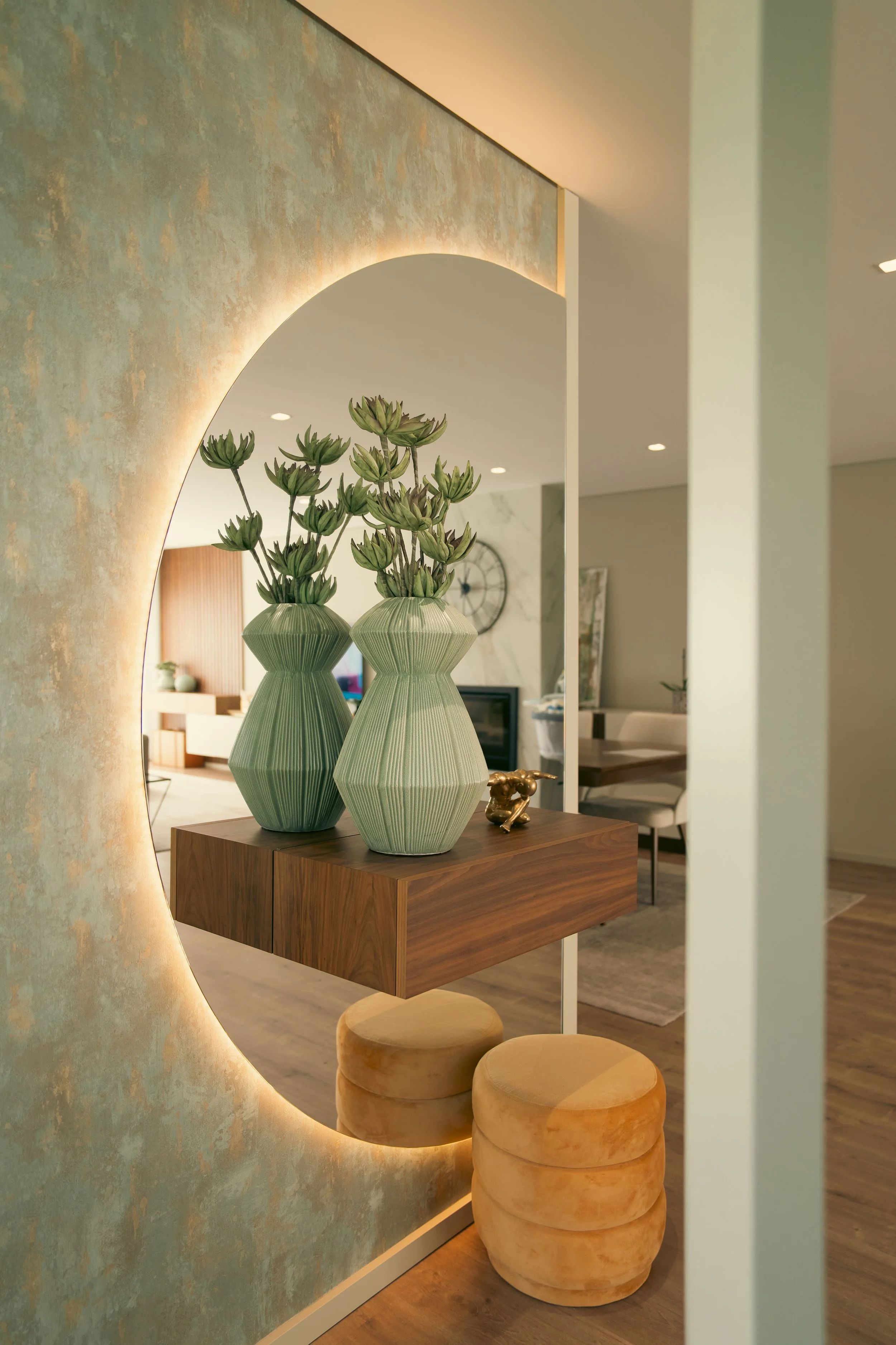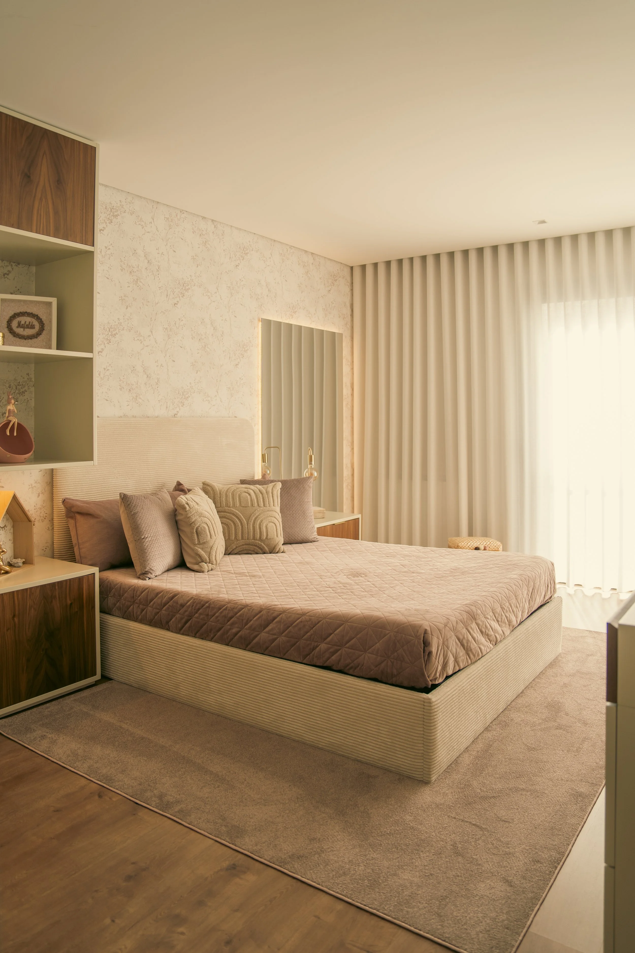 Projeto de design de interiores moderno e funcional, abrangendo sala de estar, sala de jantar, quartos, cozinha com ilha e hall de entrada. Cada espaço foi cuidadosamente planeado com mobiliário por medida, tons neutros e iluminação estratégica, criando ambientes acolhedores, elegantes e harmoniosos. A cozinha com ilha alia estilo e funcionalidade, enquanto o hall de entrada oferece uma receção sofisticada. Um projeto completo que valoriza conforto, organização e estética contemporânea, ideal para quem procura decoração moderna e personalizada em toda a casa.