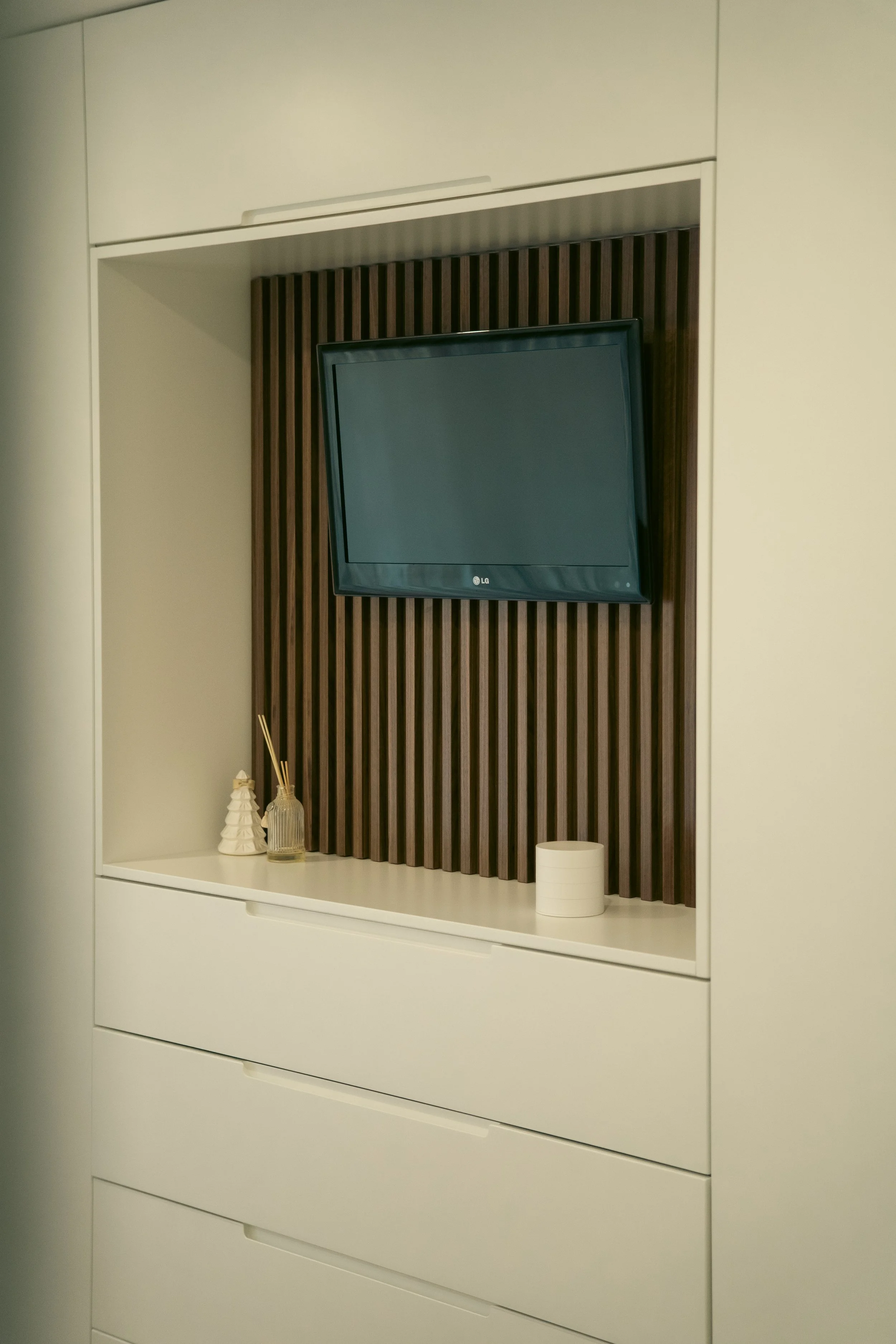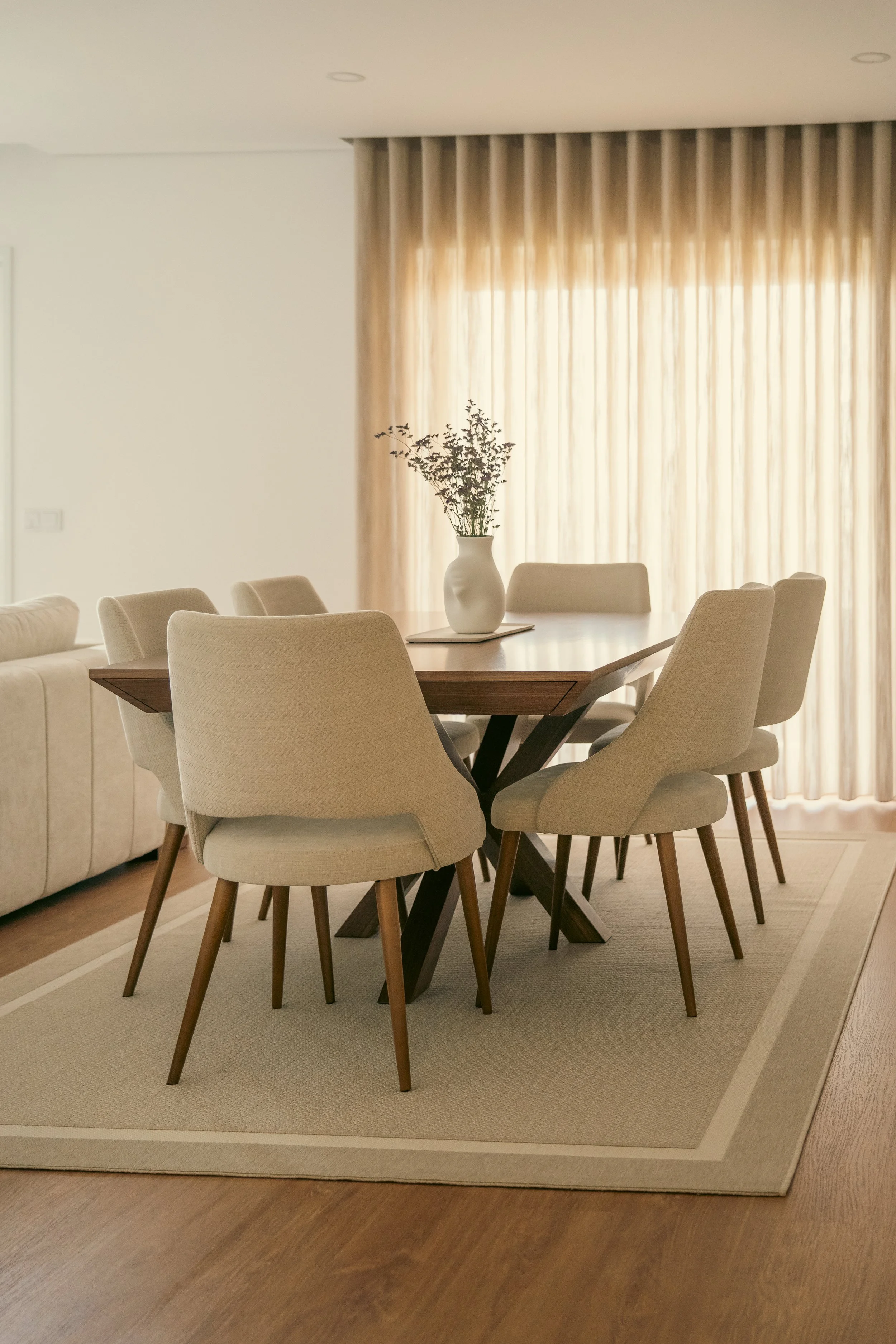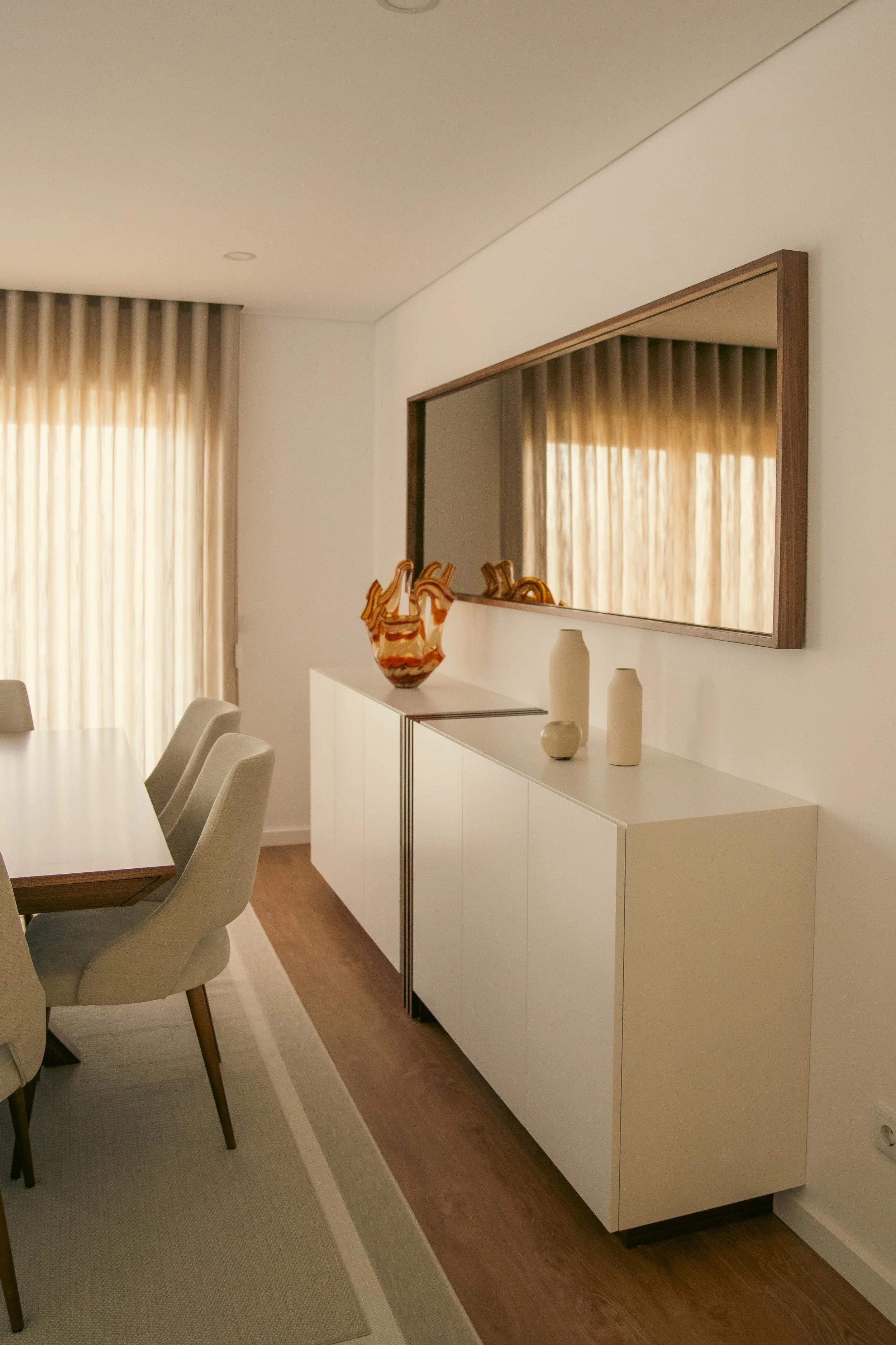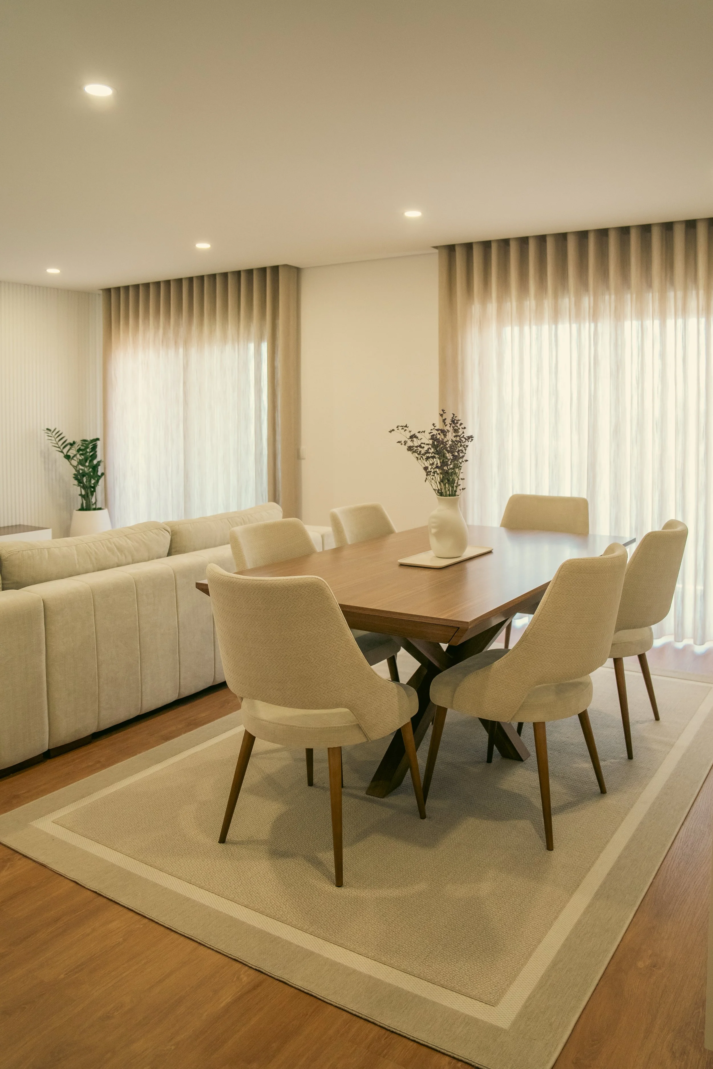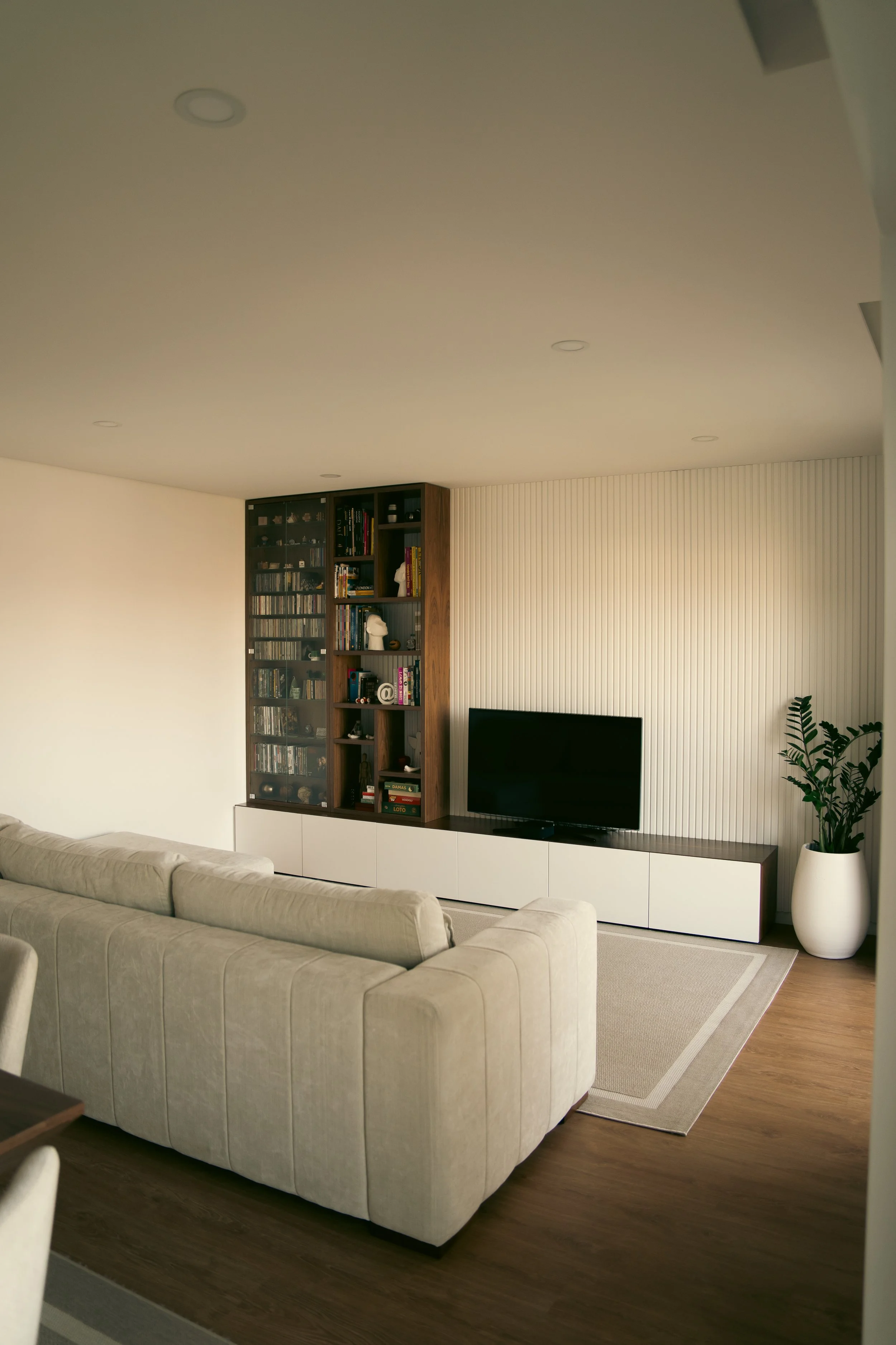 Projeto de design de interiores moderno e funcional, abrangendo sala de estar, sala de jantar, quarto e hall de entrada, com detalhes em nogueira e branco que conferem sofisticação e elegância aos ambientes. A iluminação estratégica com LEDs realça cada espaço, criando uma atmosfera acolhedora, harmoniosa e contemporânea. Com mobiliário por medida, tons neutros e acabamentos de qualidade, este projeto oferece conforto, organização e estética equilibrada, ideal para quem procura decoração moderna e personalizada.