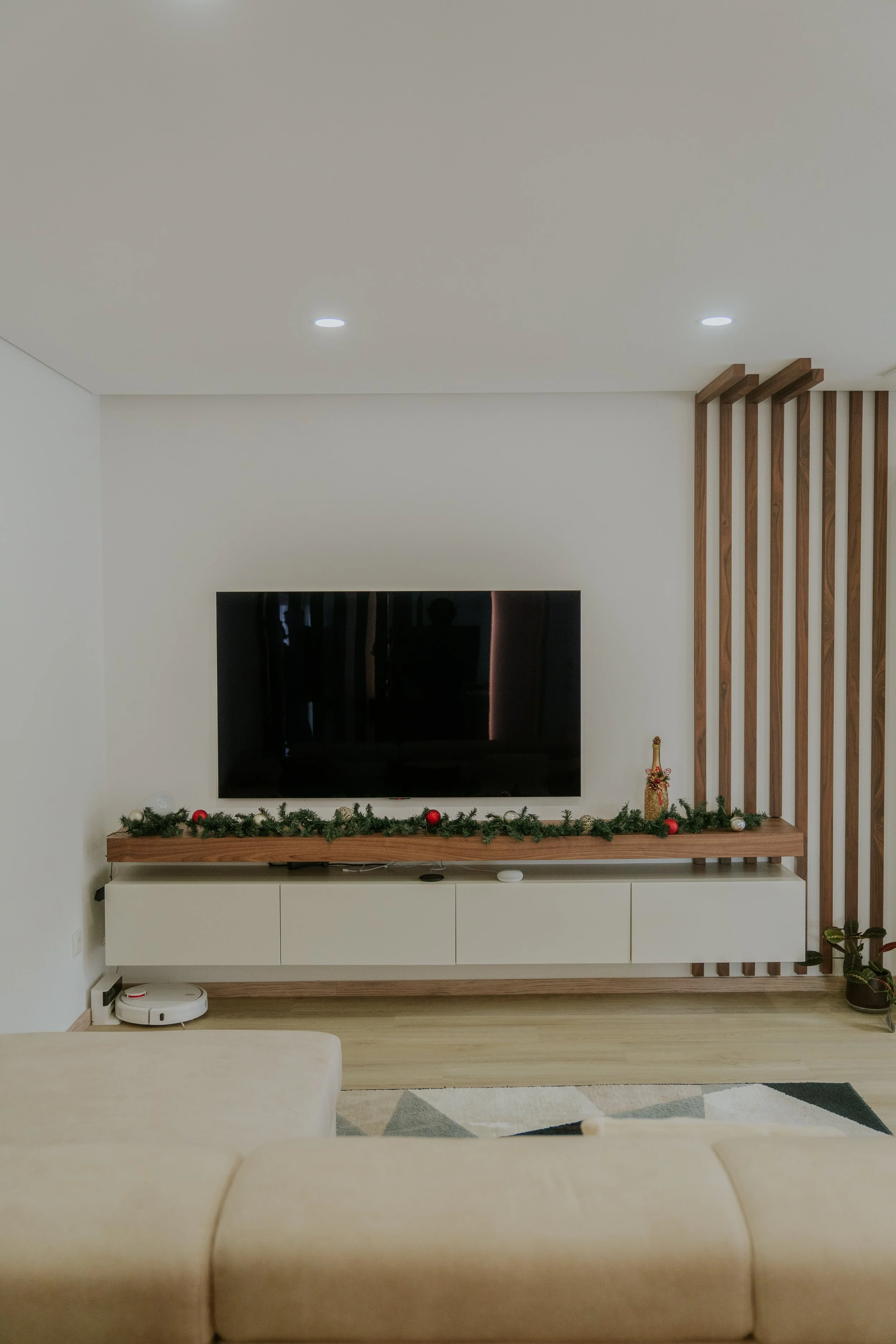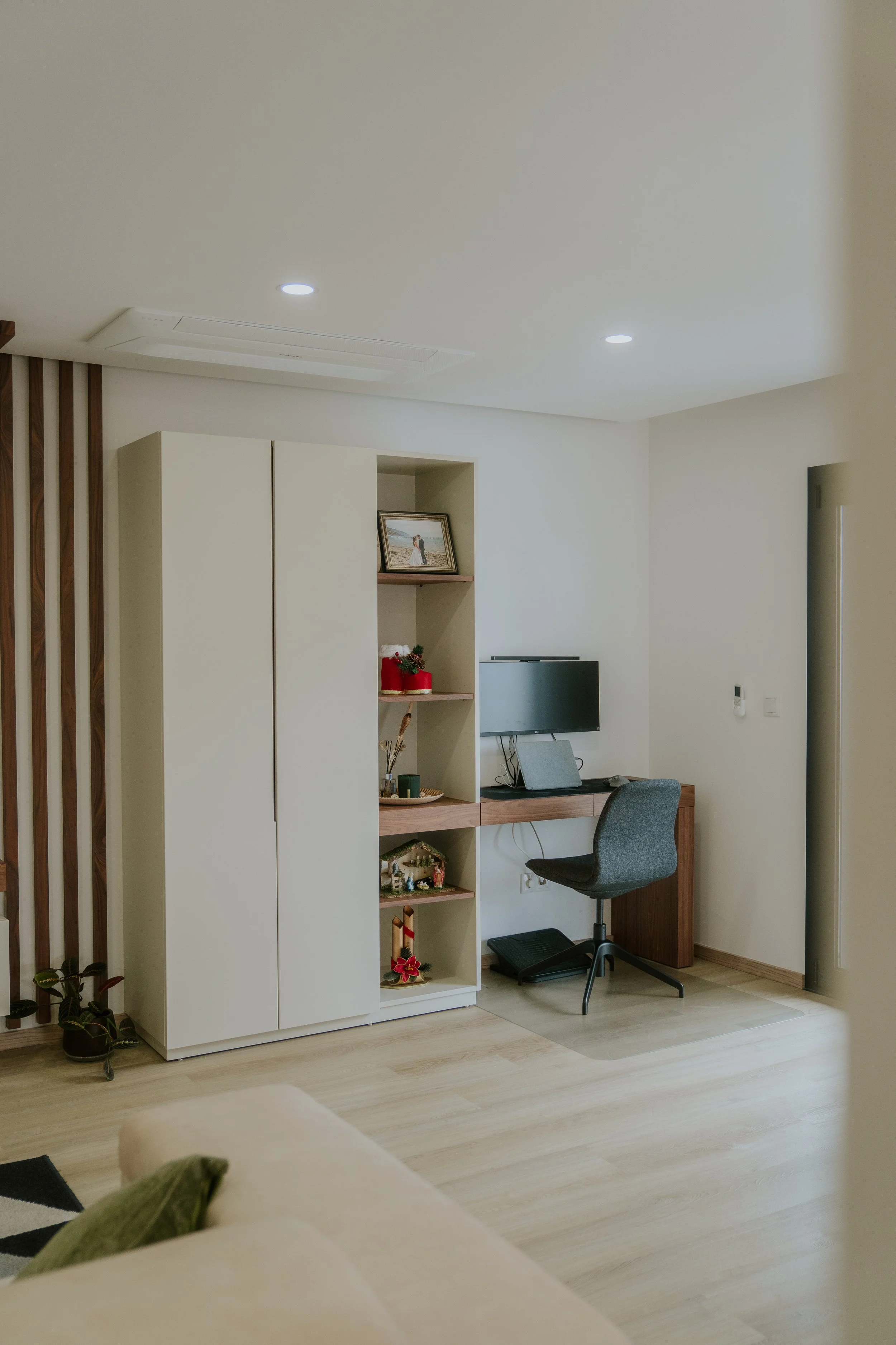 Projeto de sala de estar, sala de jantar e quarto moderno, com design de interiores contemporâneo e detalhes em nogueira, que conferem elegância, calor e sofisticação aos espaços. Com mobiliário por medida, tons neutros e iluminação estratégica, os ambientes destacam-se pela harmonia visual, funcionalidade e conforto. Uma solução personalizada que valoriza estética, bem-estar e decoração moderna com acabamentos de qualidade.