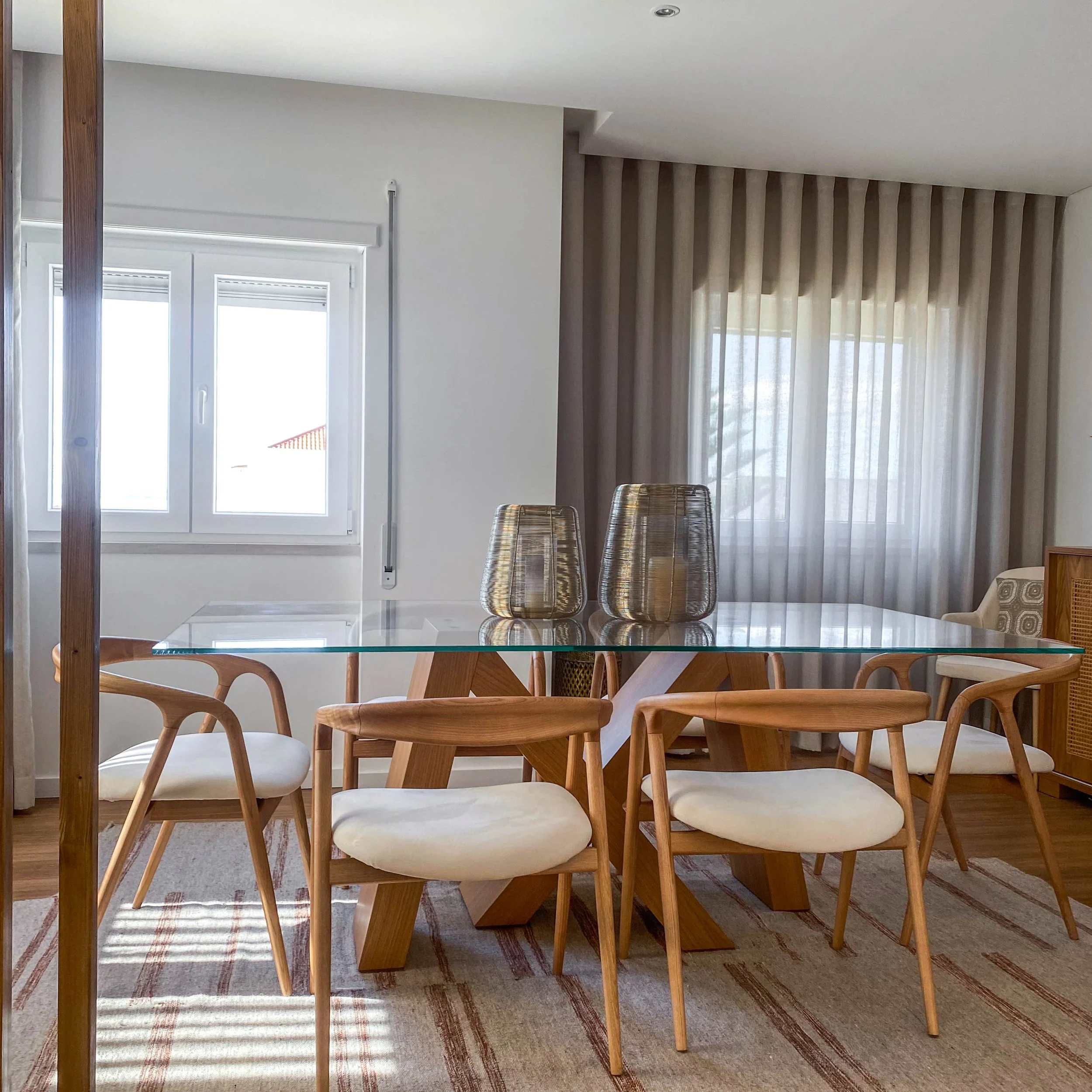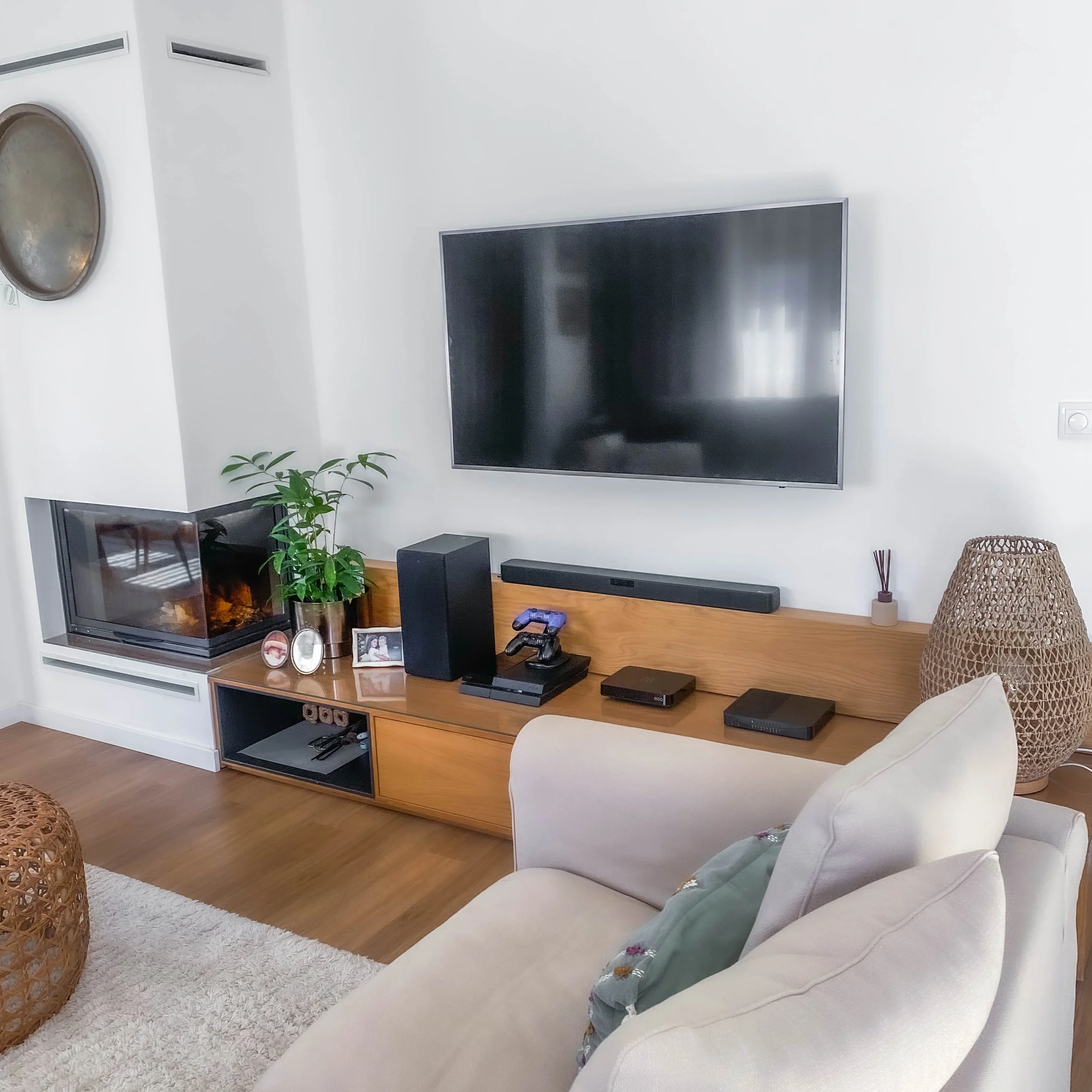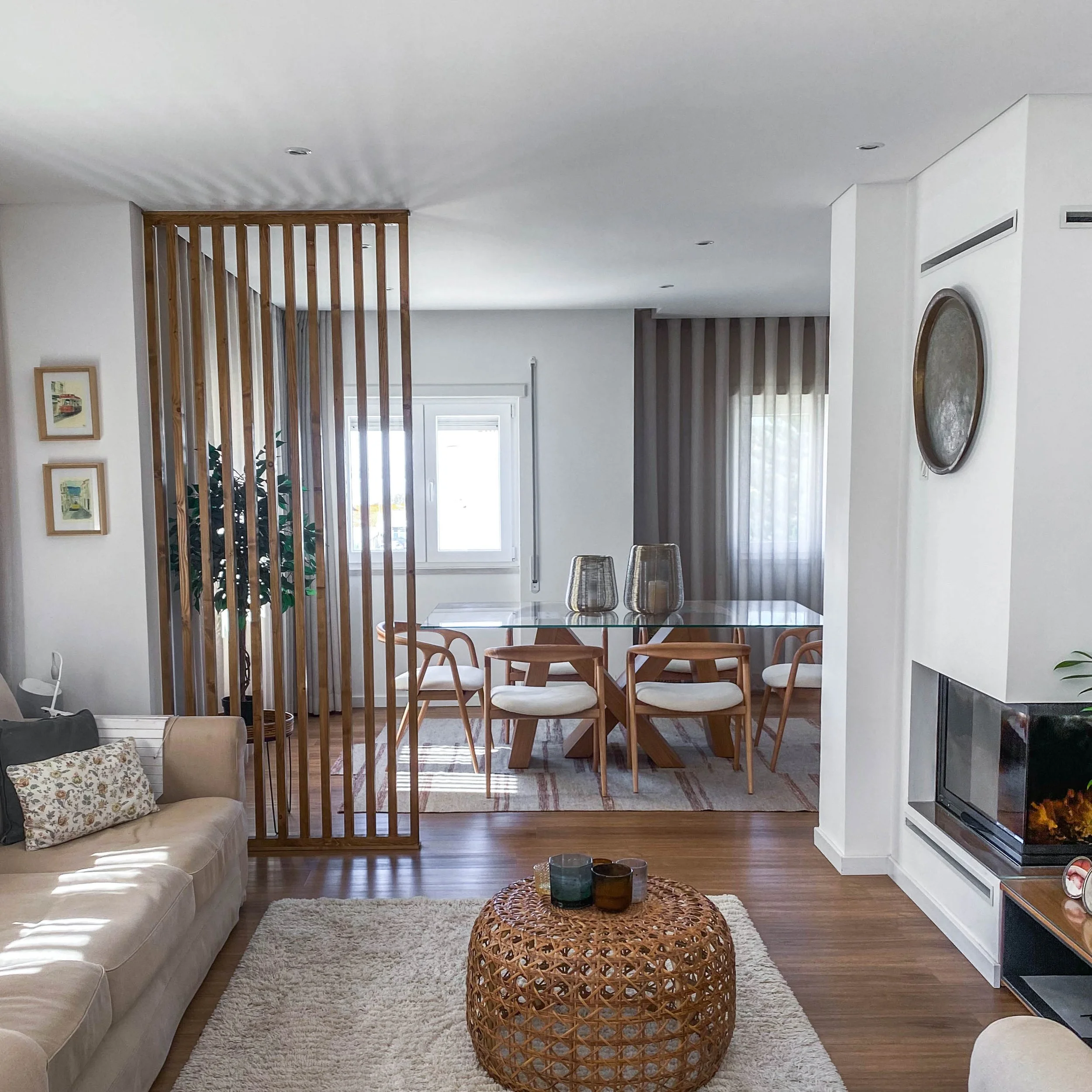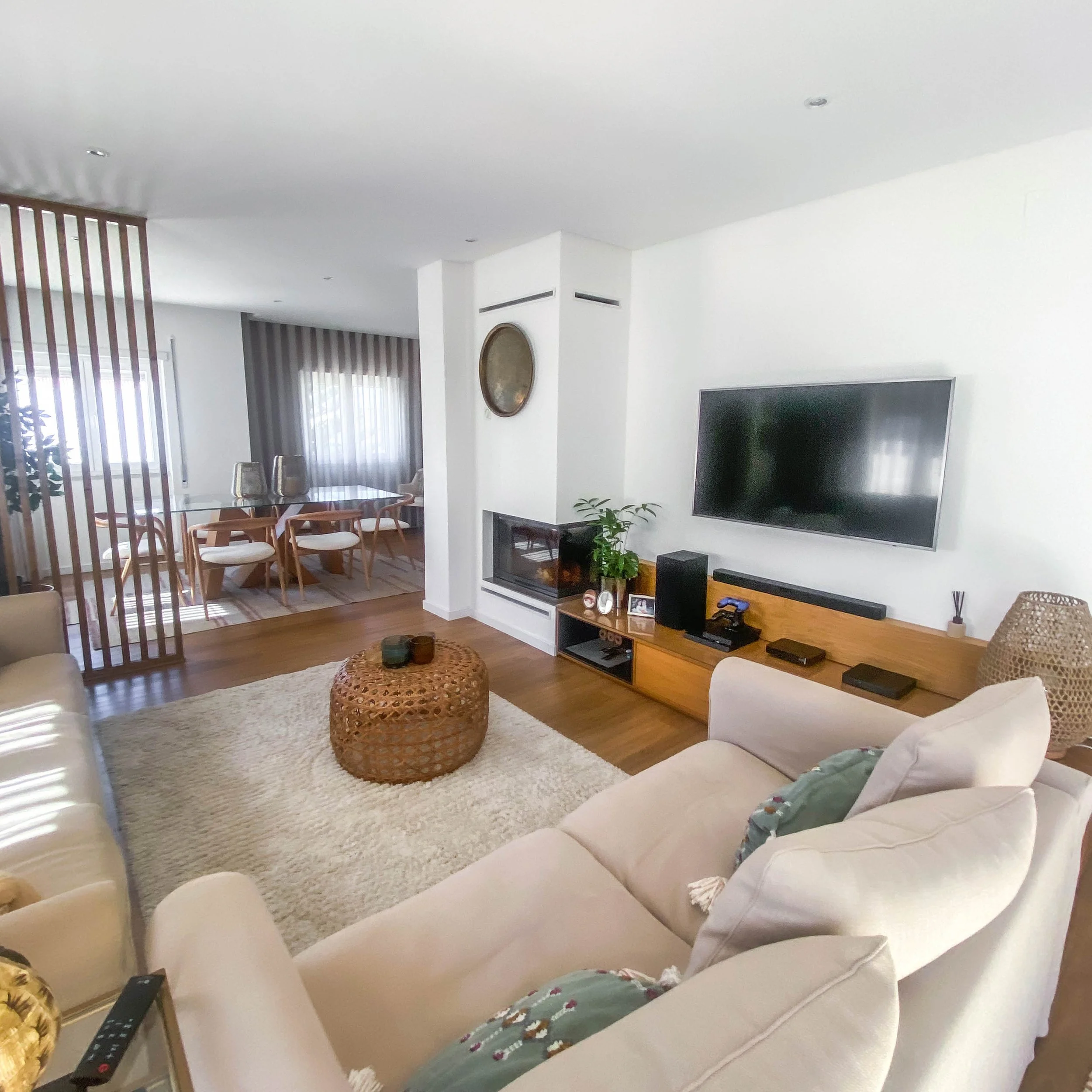 Projeto de sala de estar e sala de jantar moderna, com decoração contemporânea e mobiliário por medida. Destaque para o móvel com palhinha, que adiciona textura, elegância e um toque natural ao espaço, combinando com tons neutros, iluminação suave e materiais de qualidade. Um ambiente funcional, acolhedor e sofisticado, ideal para quem procura design de interiores moderno com elementos naturais e decorativos.